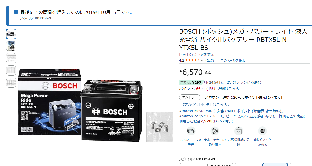 購入前にAmazonで大方の価格をチェックしてから2りんかんに行ったらGSユアサ製(YTX5L-BS)がAmazon比数十%ONの価格で販売されてた(どちらも当時価格)のを確認。