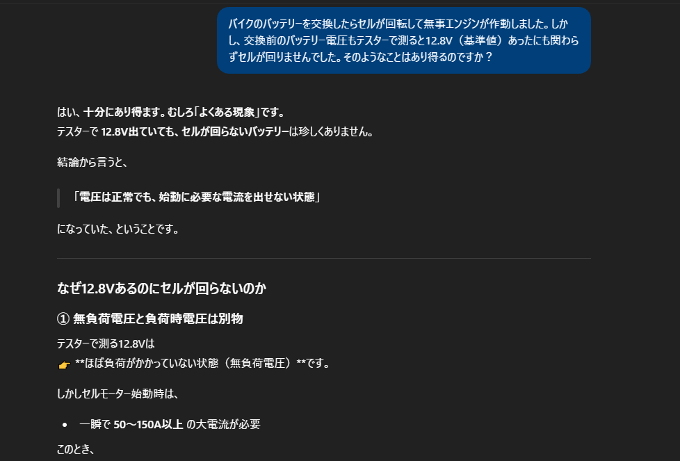 交換前のバッテリーが12.8Vあったにも関わらずセルが回らない&回っても低回転でエンジンが始動しなかった原因について調べると、無負荷状態(≒外した状態)で12.8V出てもセルモーター始動時は負荷がかかって電圧が大きく下がる(だからまともに機能しない)ことがあるとの回答が得られました。旧バッテリーはこの状態だったんだろうなと思われます。