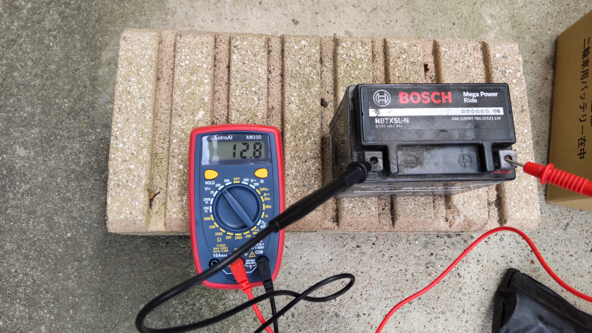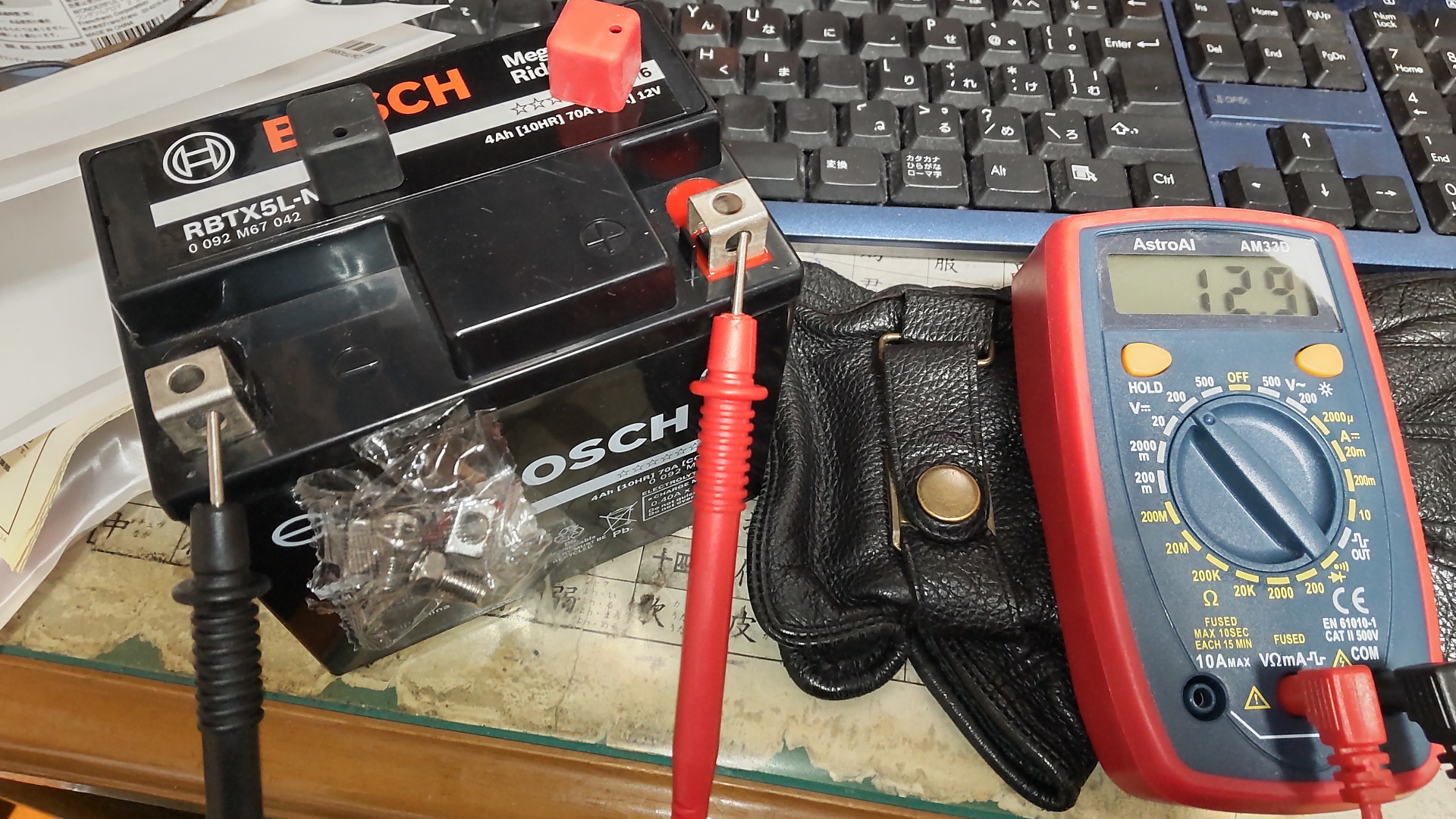 テスターでチェックしたら12.9Vと出た。充電バッチリ。早速交換へ。